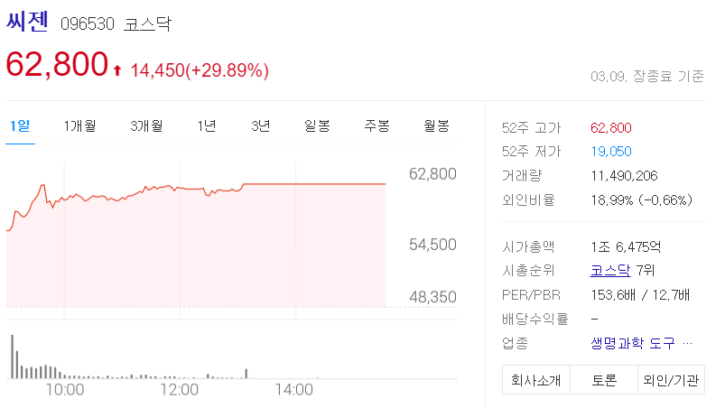 이 글을 쓰는 3/9일엔 코로나 때문에 진단키트를 만드는 씨젠이 급등했다.