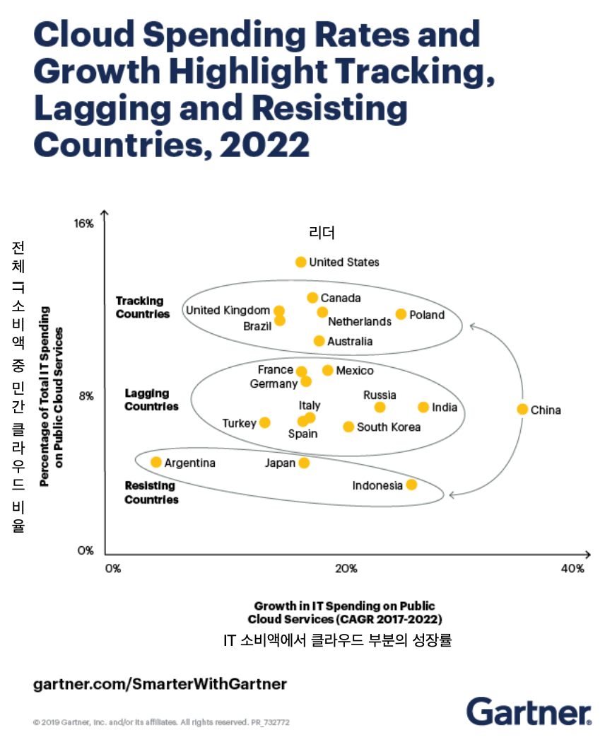 중국 및 한국이 상위 국가에 비해서 클라우드 이용률이 낮다고 생각하셔도 됩니다.