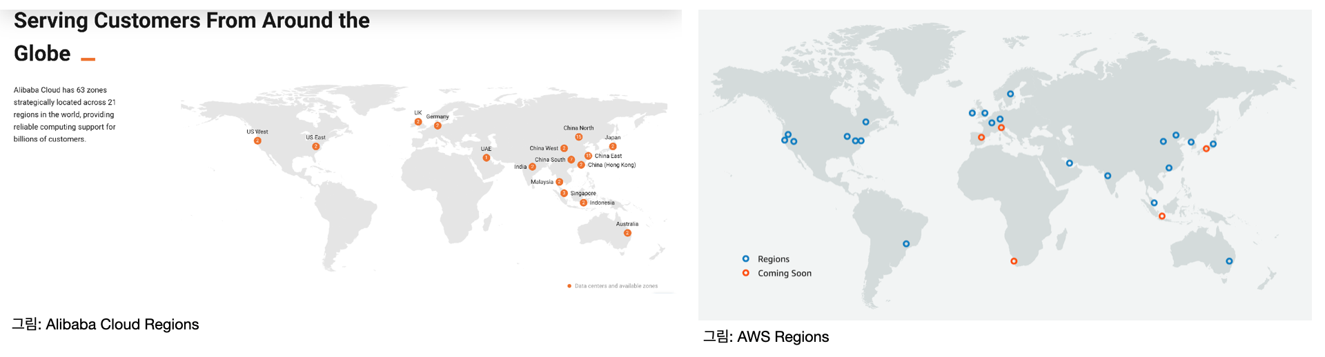 알리바바와 AWS 홈페이지에서 개략적으로 보여주는 지도입니다.