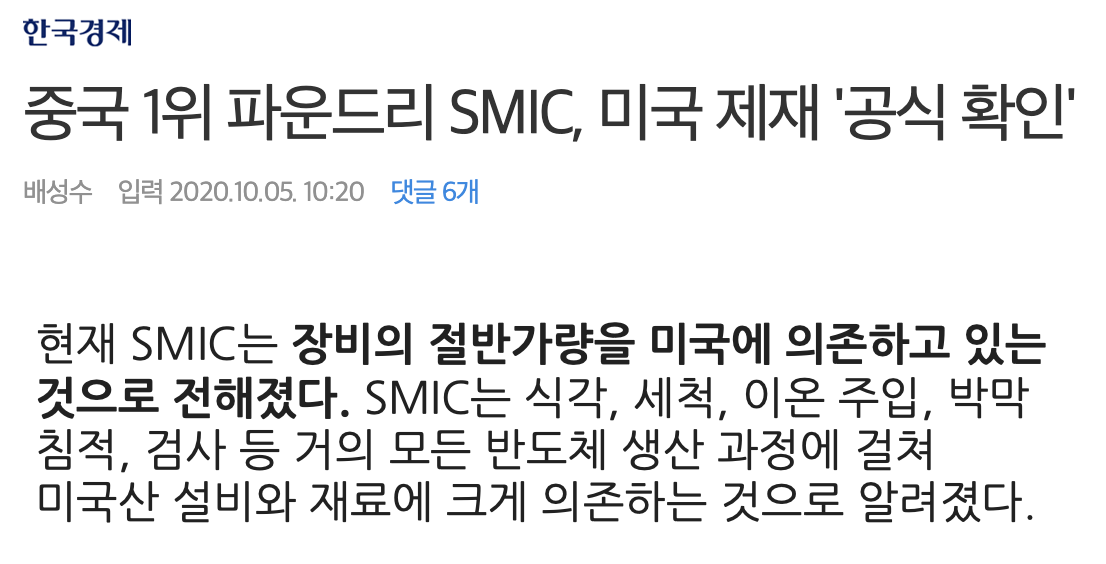 미국 SMIC 제재 공식 확인 기사: https://news.v.daum.net/v/20201005102002187