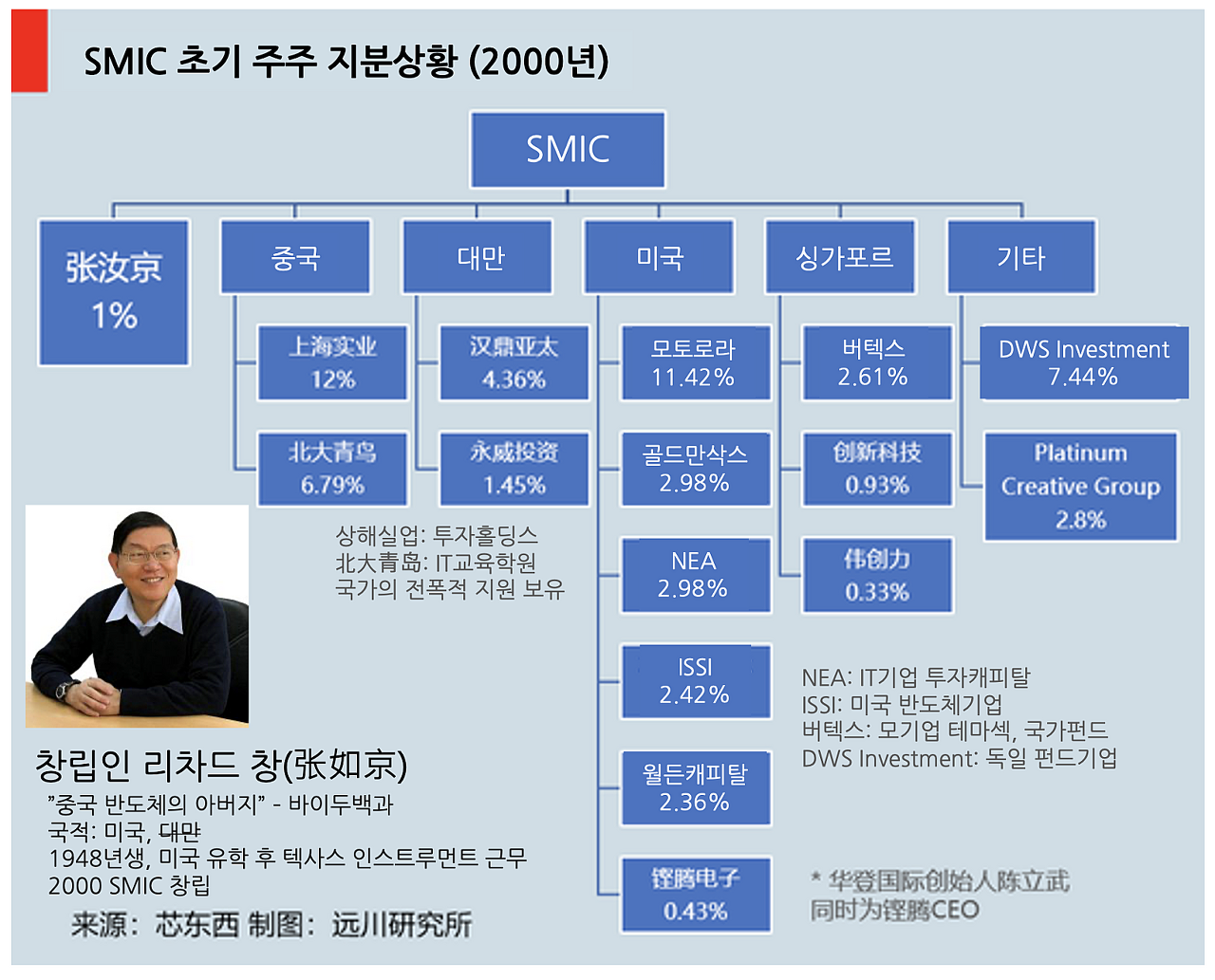 창립자인 리차드 창(장루징)은 TSMC를 세운 모리스 창과 같이 Texas Instrument에서 근무해 부사장의 자리까지 오릅니다.