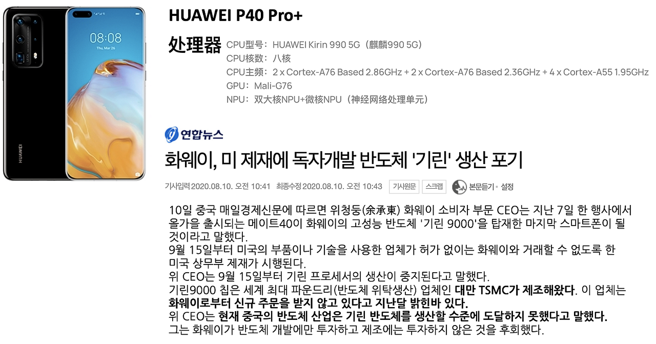 실제로 삼성의 갤럭시 노트 정도에 해당하는 포지션인 화웨이의 P 시리즈는 TSMC가 생산한 7nm 공정의 칩이 들어갑니다.