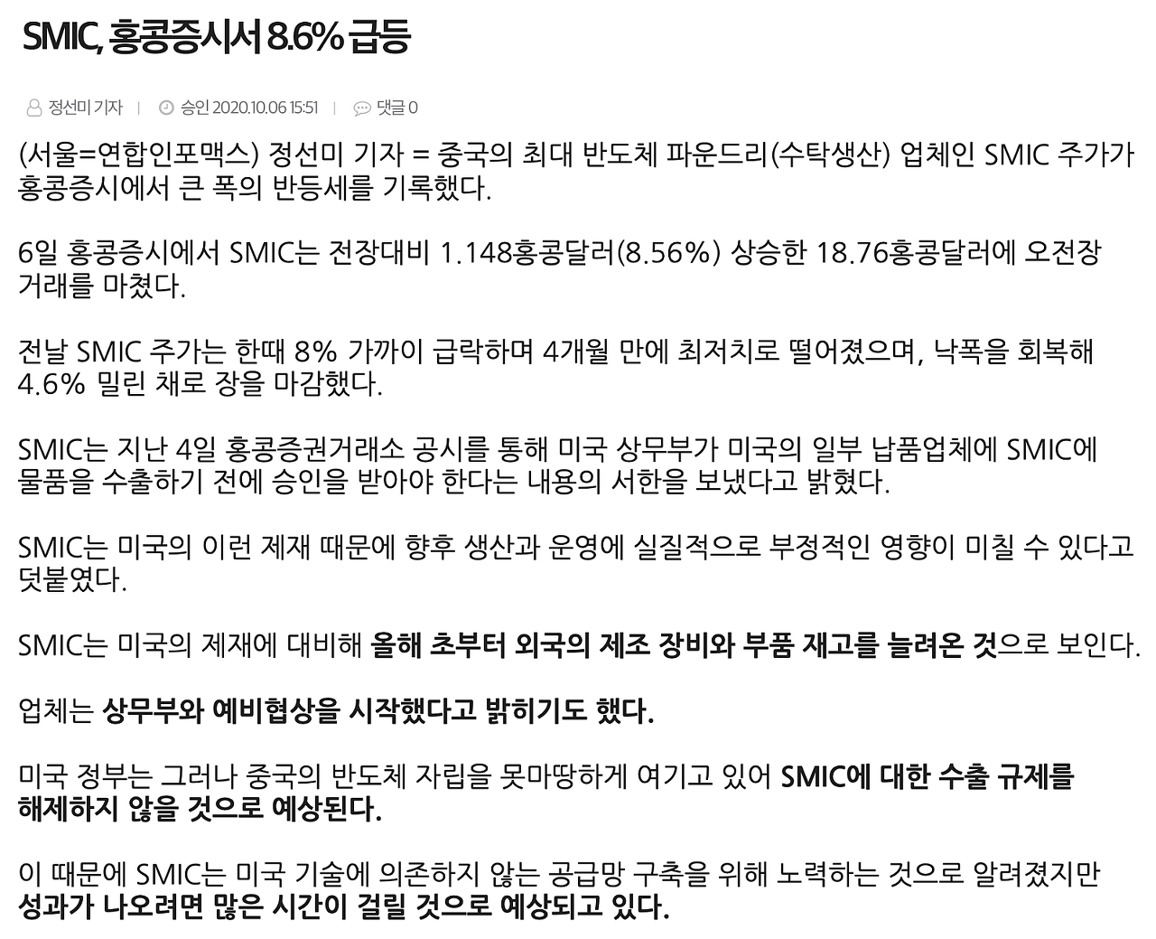 홍콩 증시 SMIC 급등 기사: https://news.einfomax.co.kr/news/articleView.html?idxno=4110700