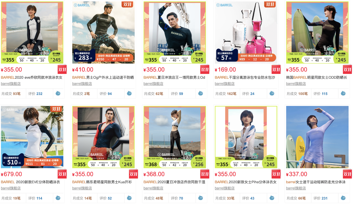 배럴의 품목당 월 판매량(月成交)은 검색 결과 제일 싼 래쉬가드인 짝퉁 상품(바지에 배럴 슬로건인 Life is Swell을 집어넣음)과