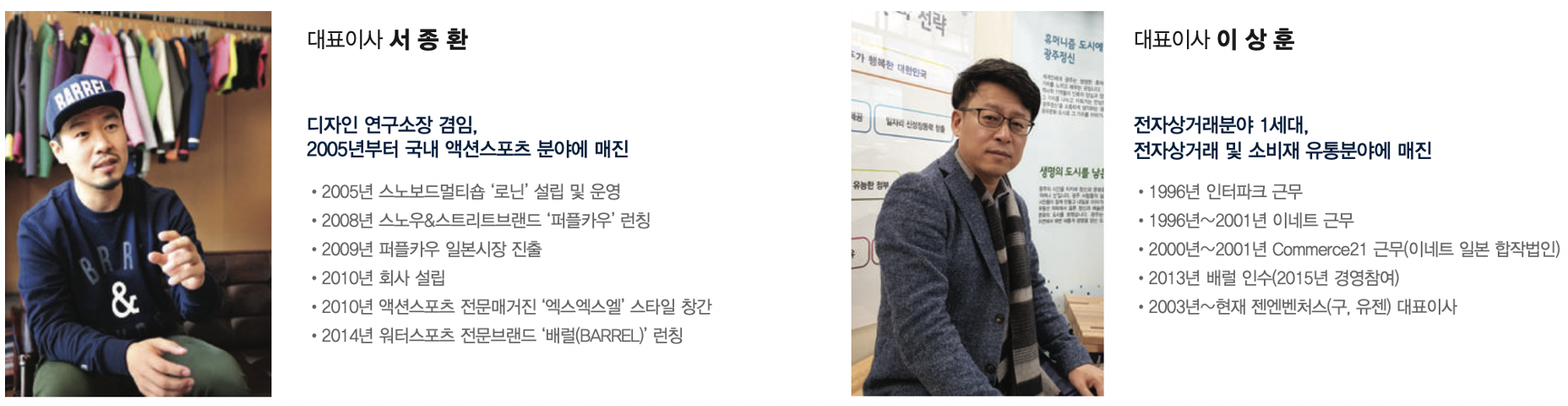 경영 및 사업 담당은 이상훈 대표, 제품 개발 등은 서종환 대표가 담당하는 공동이사 체제로 회사를 유지 중입니다.