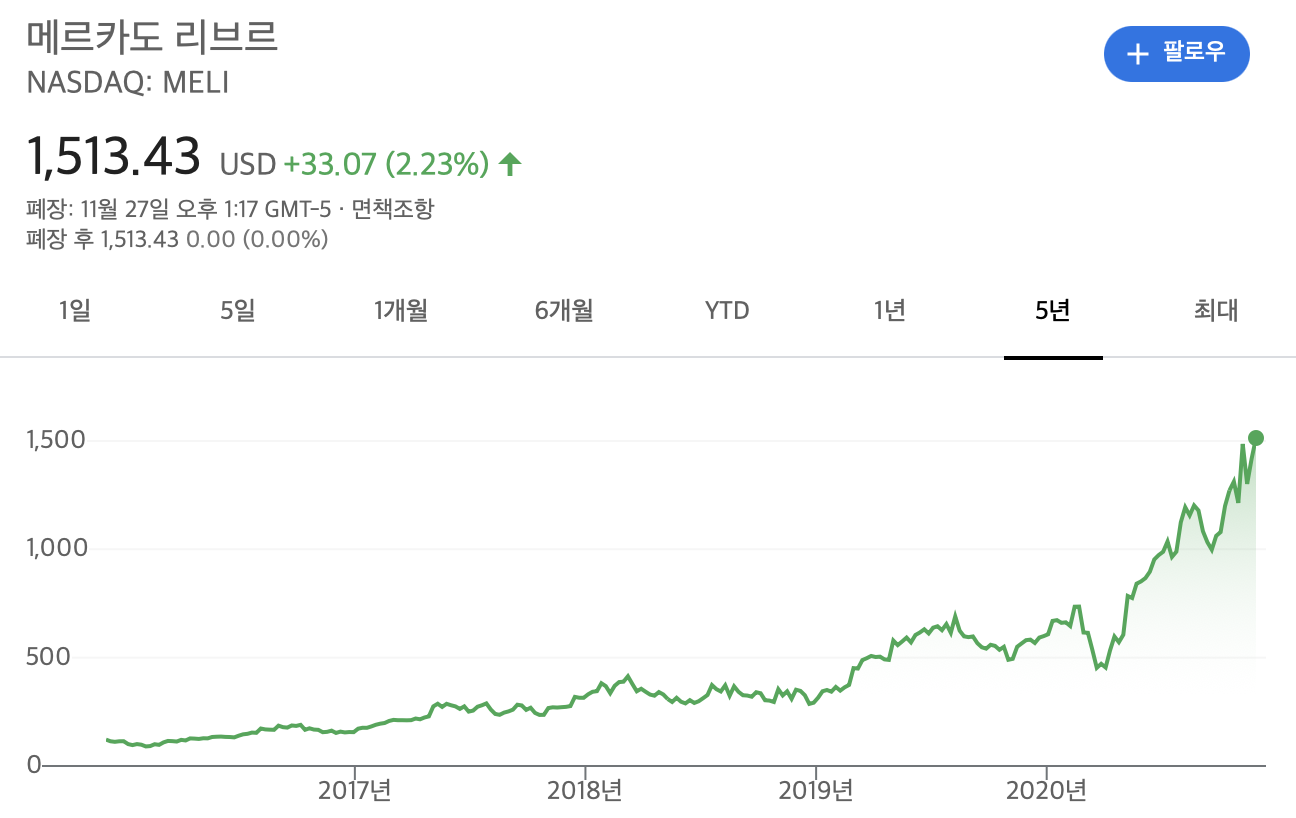 '남미의 아마존'이라고 부르는 MercadoLibre(메르카도리브레)가 최근 급격히 상승했습니다.