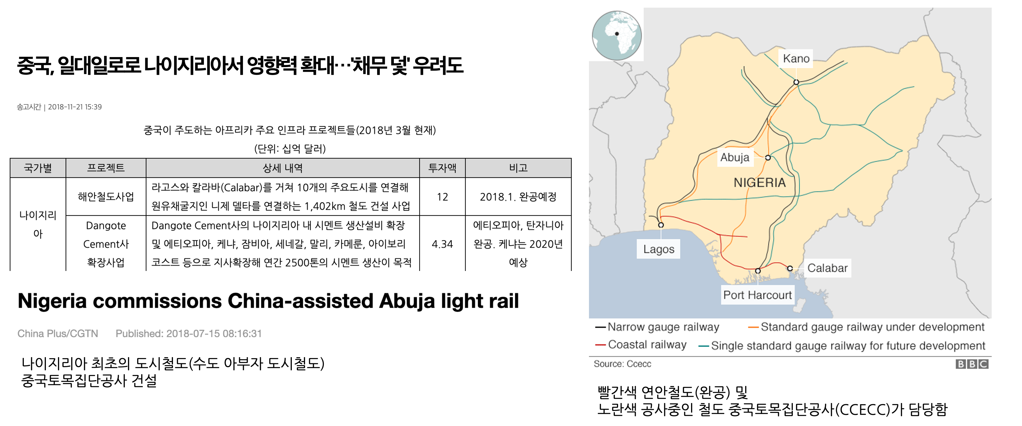 중국의 원조로 건설 중인 나이지리아의 철도: https://www.bbc.com/news/world-africa-42172955