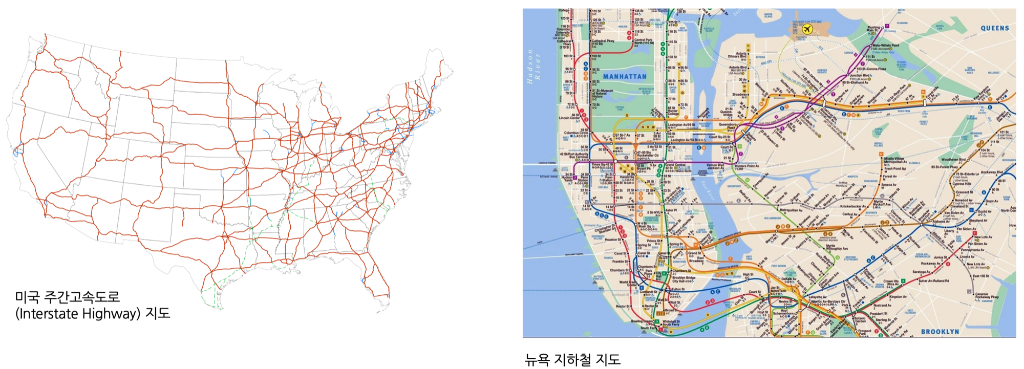 미국은 1956년 아이젠하워 대통령의 주간고속도로(Interstate Highway) 계획을 시작으로 고속도로가 매우 촘촘하게 깔려 있습니다.