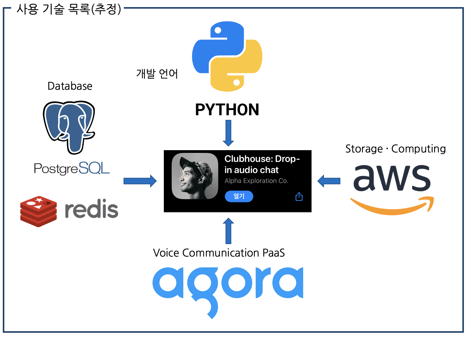 클럽하우스는 개발 언어로 파이썬을 사용하며, DB는 Postgre SQL을 사용하는 것 같습니다.