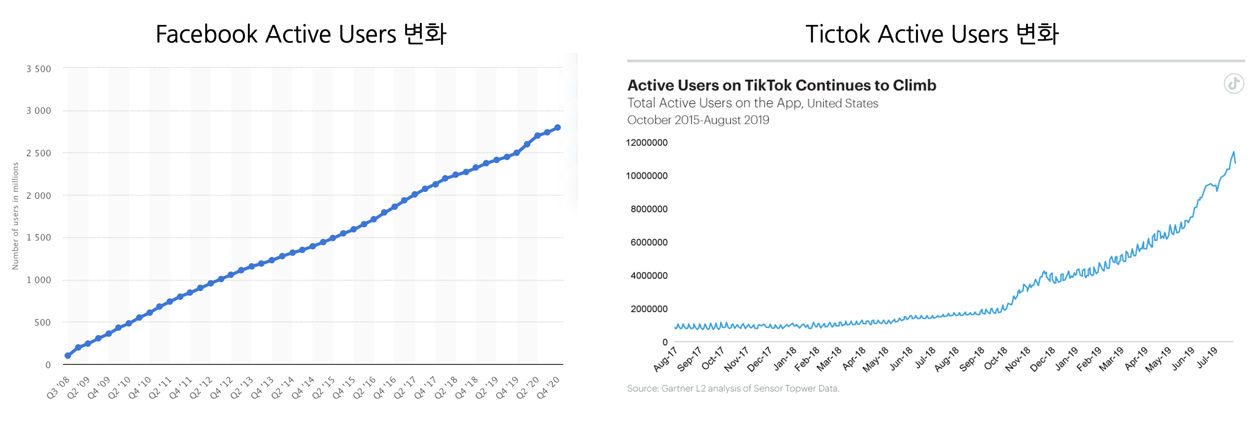 또한 새로운 방식의 SNS 플랫폼을 선보인 페이스북과 틱톡을 예로 들어 활성 사용자 추이를 살펴볼 때,
