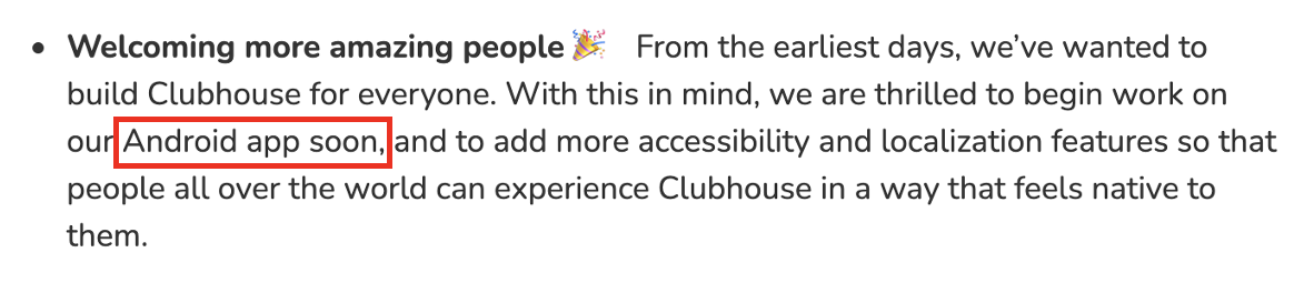 개인적으로는 클럽하우스가 이와 비슷하거나 조금 더 빠른 기간인 약 1년~1년 6개월 내에 안드로이드를 출시할 수 있을 것이라고 조심스럽게 예측합니다. 이를 클럽하우스 런칭월인 2020년 4월에 적용하면, 2021년 4월~10월 정도가 되겠지요.