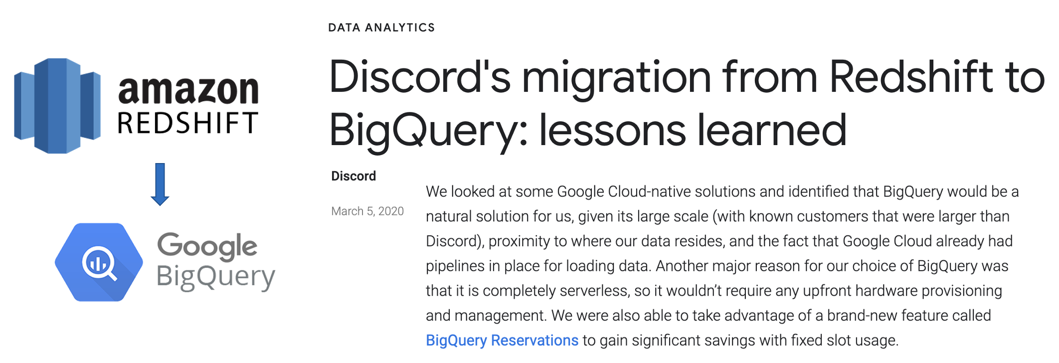 Discord의 빅데이터 플랫폼 이동 관련 글: https://cloud.google.com/blog/products/data-analytics/redshift-to-bigquery-migration-for-gaming-app